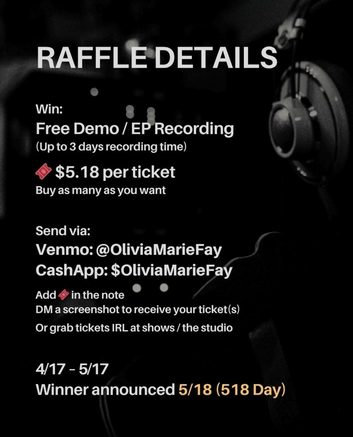 To enter the raffle, send @oliviamariefay $5.18 on either venmo or cash app with a ticket emoji 🎟 in the note. You can also purchase tickets in person at shows (trust me, you'll see them both around) or at the studio. DM @pacemaker_audio to coordinate. The winner will be announced on 5/18.