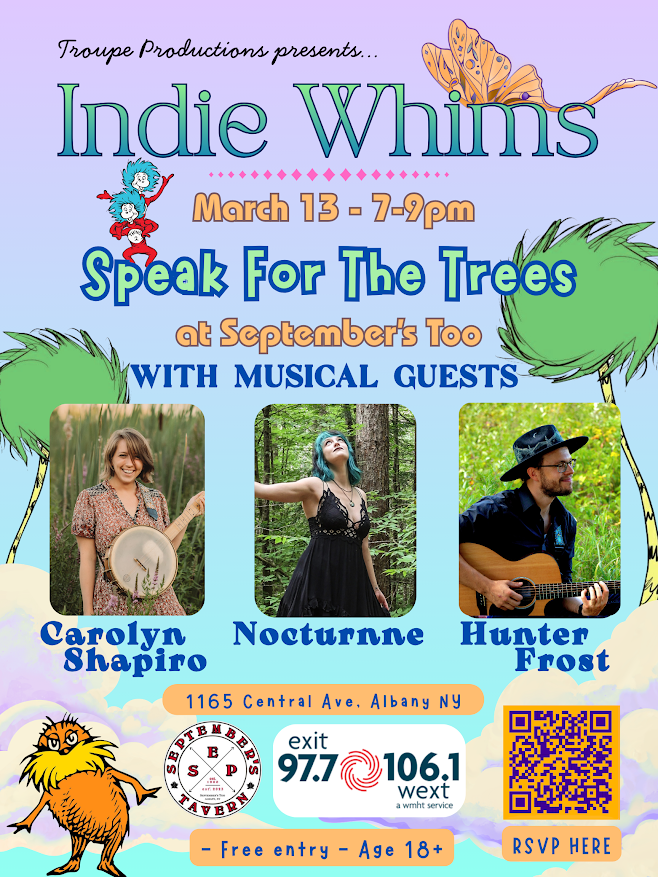 RSVP to secure your seats at: https://www.keeganjamesmusic.com/event-details/indie-whims-speak-for-the-trees/form