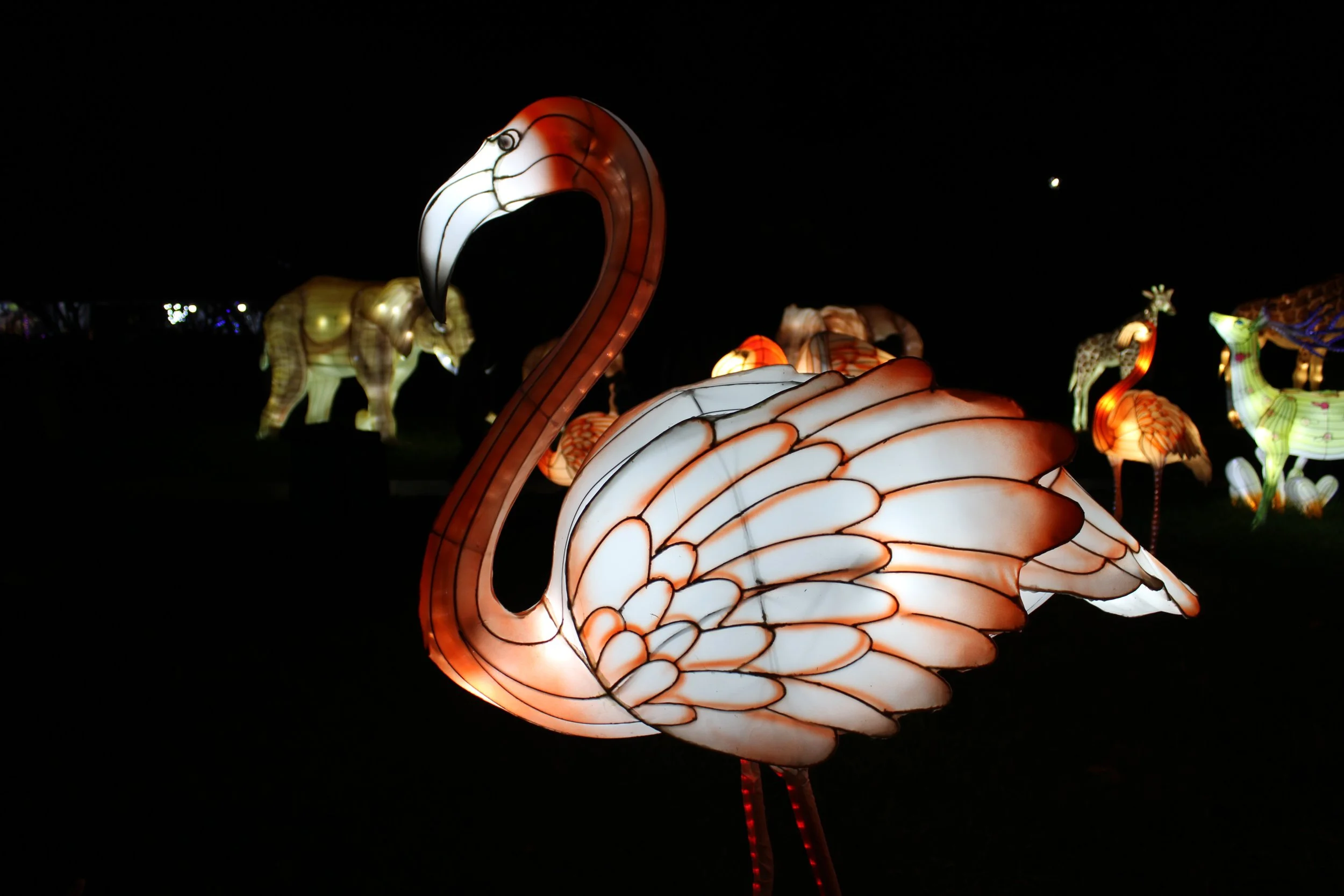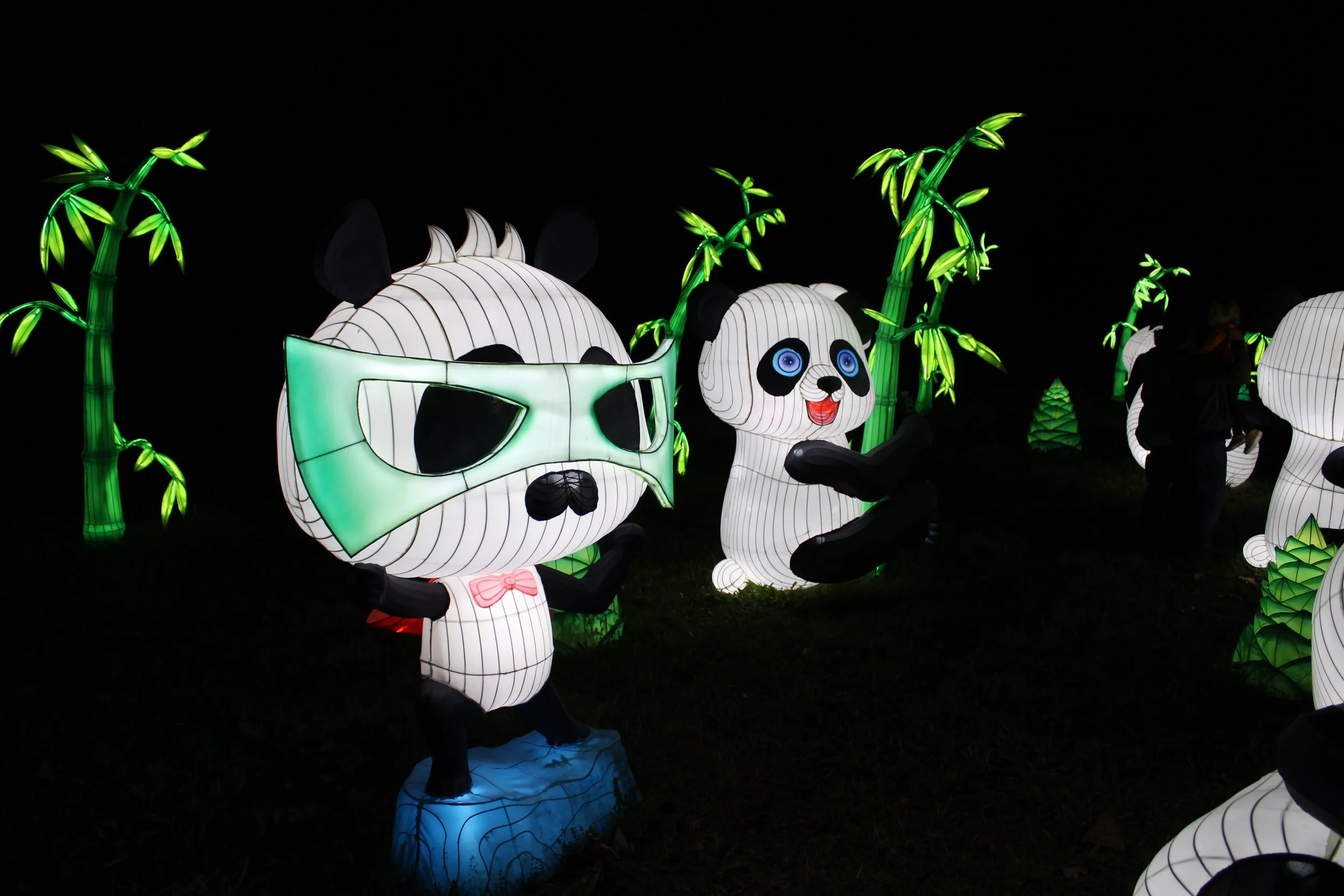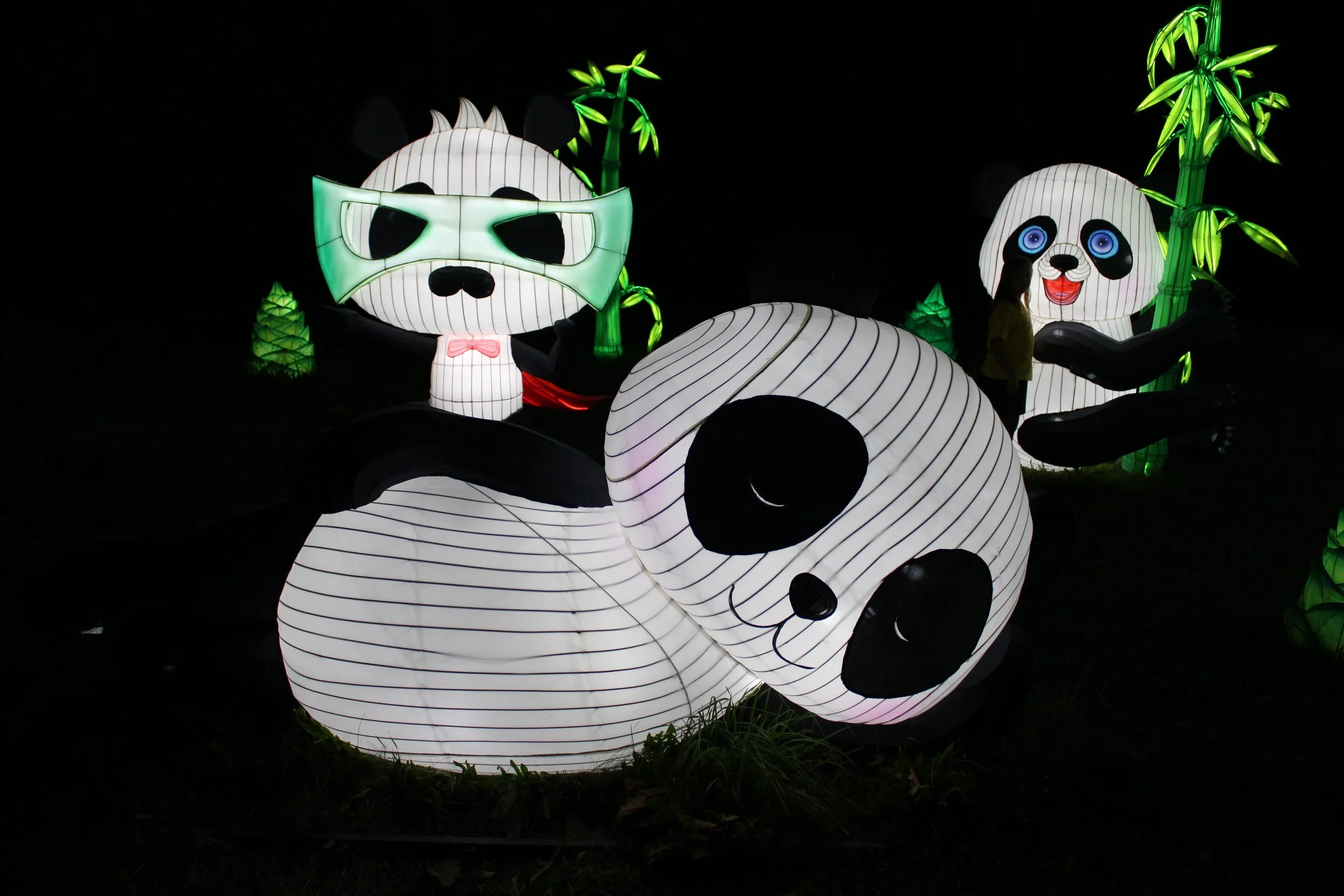 My kids – ages 3 and 8 – both emitted audible oohs at their first sight of the displays, particularly excited by each new group of animals they spotted. It was as if the Autumn Glow Festival created its very own, illuminated zoo where attendees could fawn over the animals from up close and personal. From pandas to giraffes to elephants to flamingos, the festival seemed to have a favorite animal for everyone. The pandas were particularly whimsical, each one displayed with its own unique personality. Kids from all families were having a ball wandering through them, “petting” each one and mimicking their respective poses for photographs.