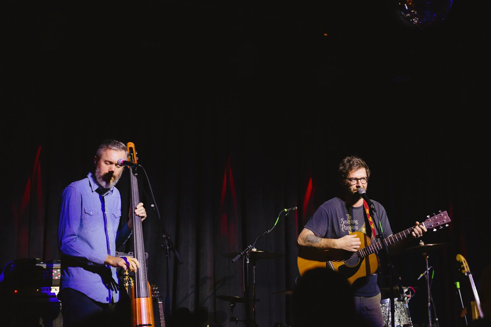 AJJ kicked off the night in duo form, the pair wielding an acoustic guitar and an electric upright bass to bring folk-punk tunes to the crowd. During well known songs like “Brave as a Noun” and “Body Terror Songs” the crowd was singing along and even occasionally harmonizing. The energy was perfect for Lark Hall, filling up the space while still being intimate. They played songs off their 2007 album People Who Can Eat People are the Luckiest People in the World, the 2023 release Disposable Everything, and more. AJJ’s set was tight and well rehearsed, and was a perfect supporting act for Cursive’s more rambunctious set.