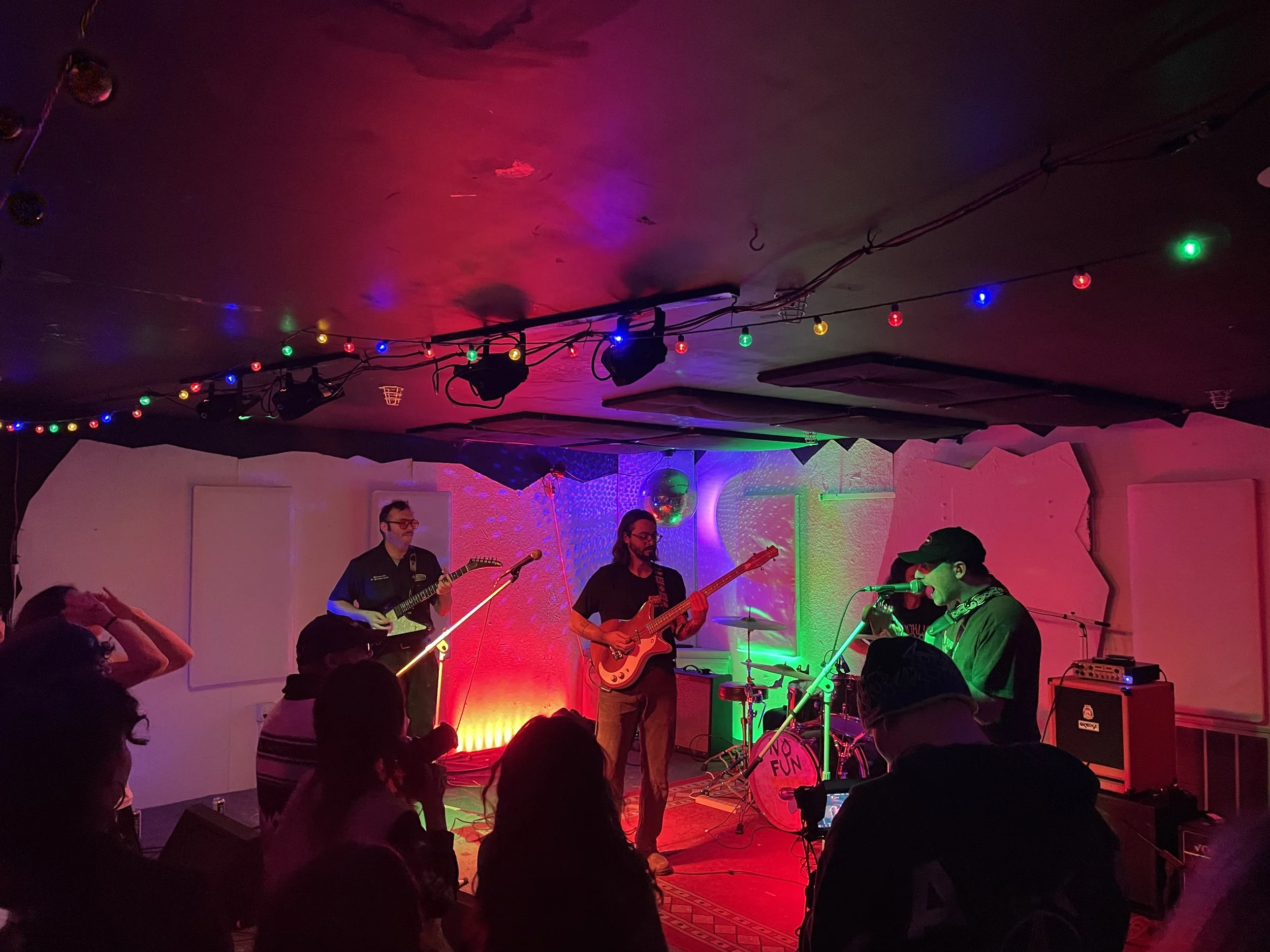It was a classic No Fun scene once I stepped foot in the doors: merch splayed across the pool table, Christmas lights and an odd string of tinsel hanging down from the ceiling, some remnants of last night’s Hellseeker event strewn across the floor, a sci-fi flick playing on the TV above the bar. Members of the opening band, Hidden Drive, hung out next to the stage, chatting with friends as they awaited the clock striking 8:00. Soon enough, the four-piece took the stage and announced themselves, though not too verbosely — their mantra is “stay hidden,” after all, so hidden in fact that I cannot find their names anywhere. Mysterious.