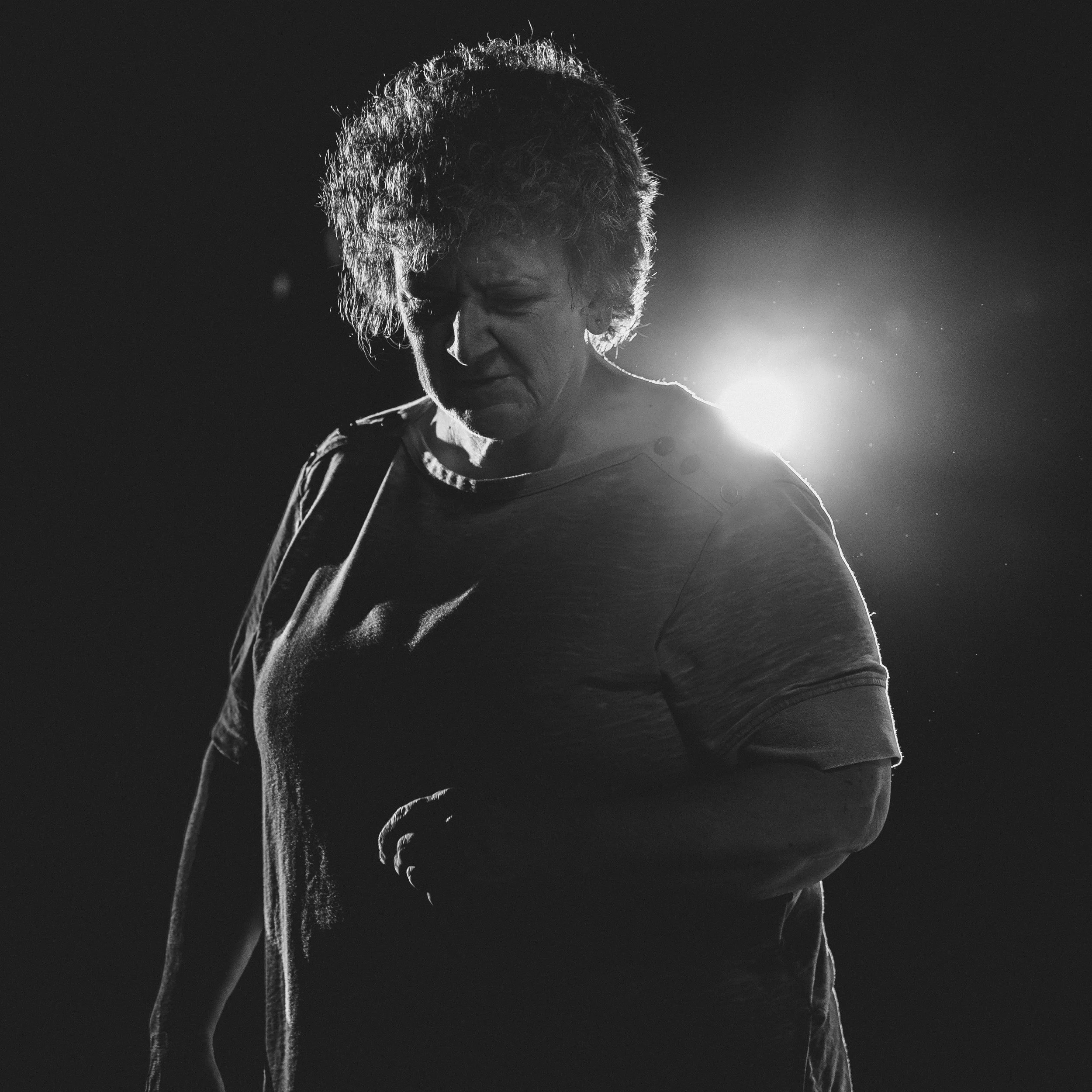 Then, Robin Leary walked on. She began to mix zucchini bread, muttering to herself as she tried to remember the recipe. Where stood a sweet, typical grandmother-type, though, soon became a woman troubled beyond belief as the audience watched her imagine self-harm acts with her baking tools, causing gasps to be emitted from several crowd members. This pairing, of deeply comforting moments like the baking of bread in a well-worn kitchen, with thoughts and even actions of death and despair, is the crux of the magic that this cast brought to Swing State.