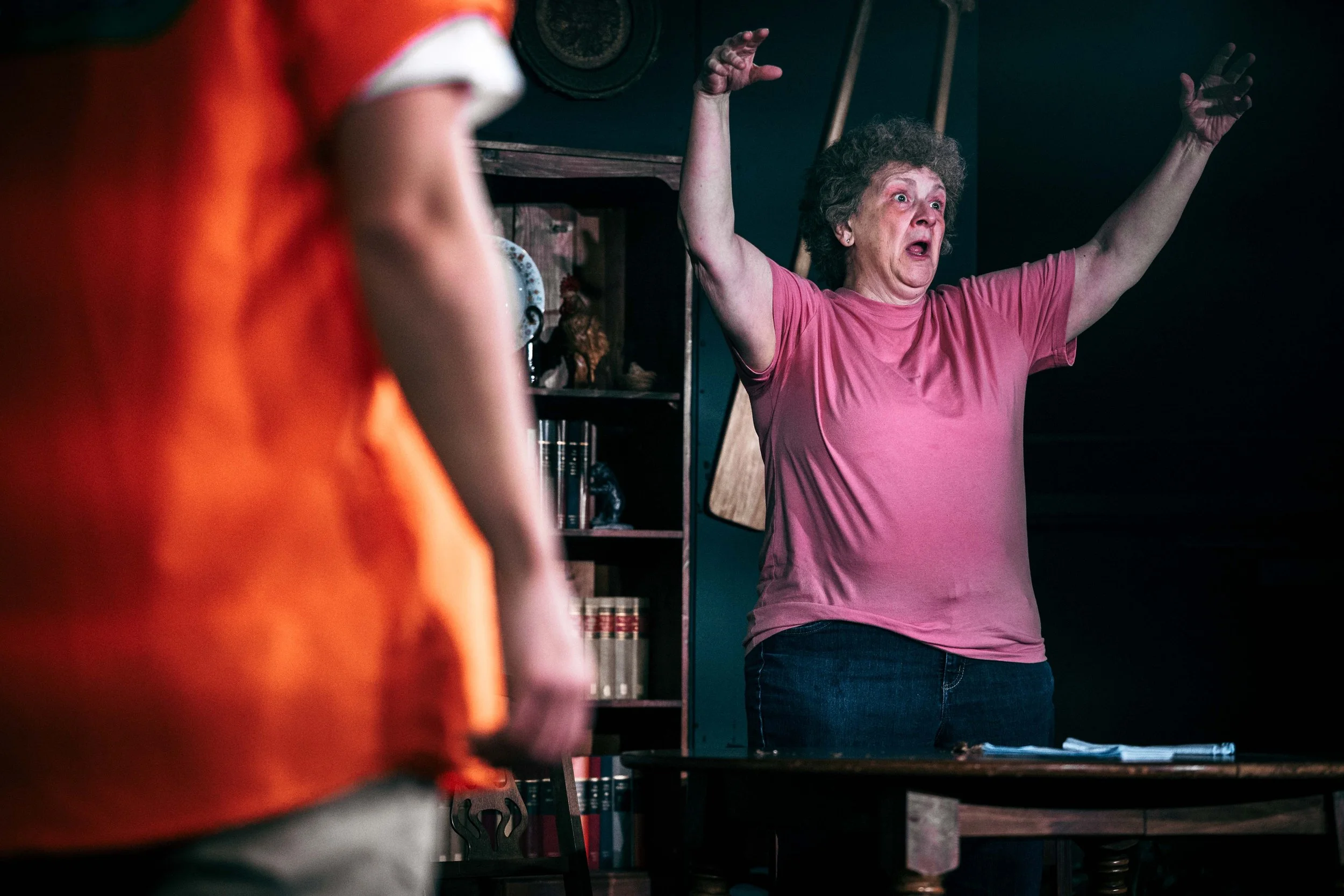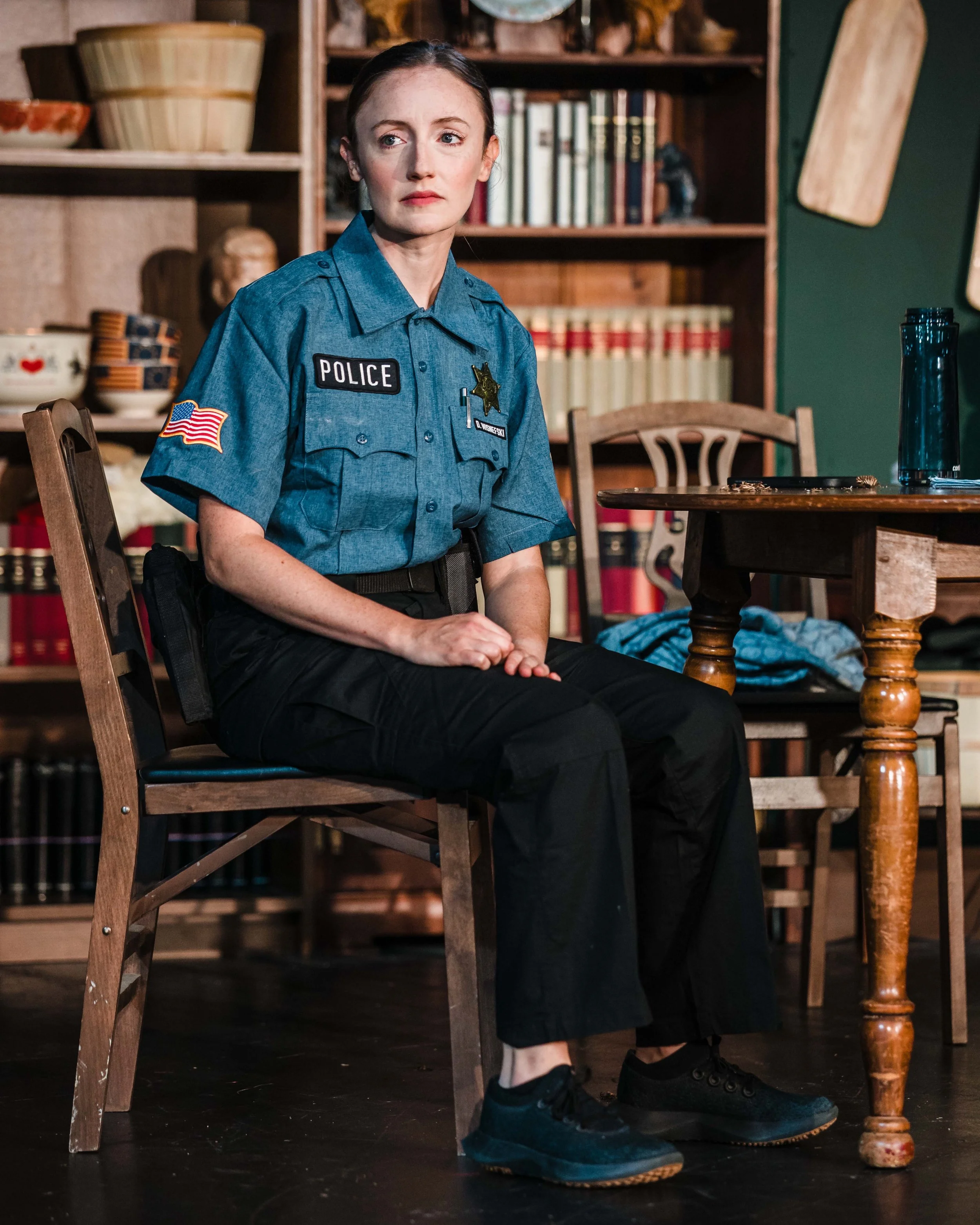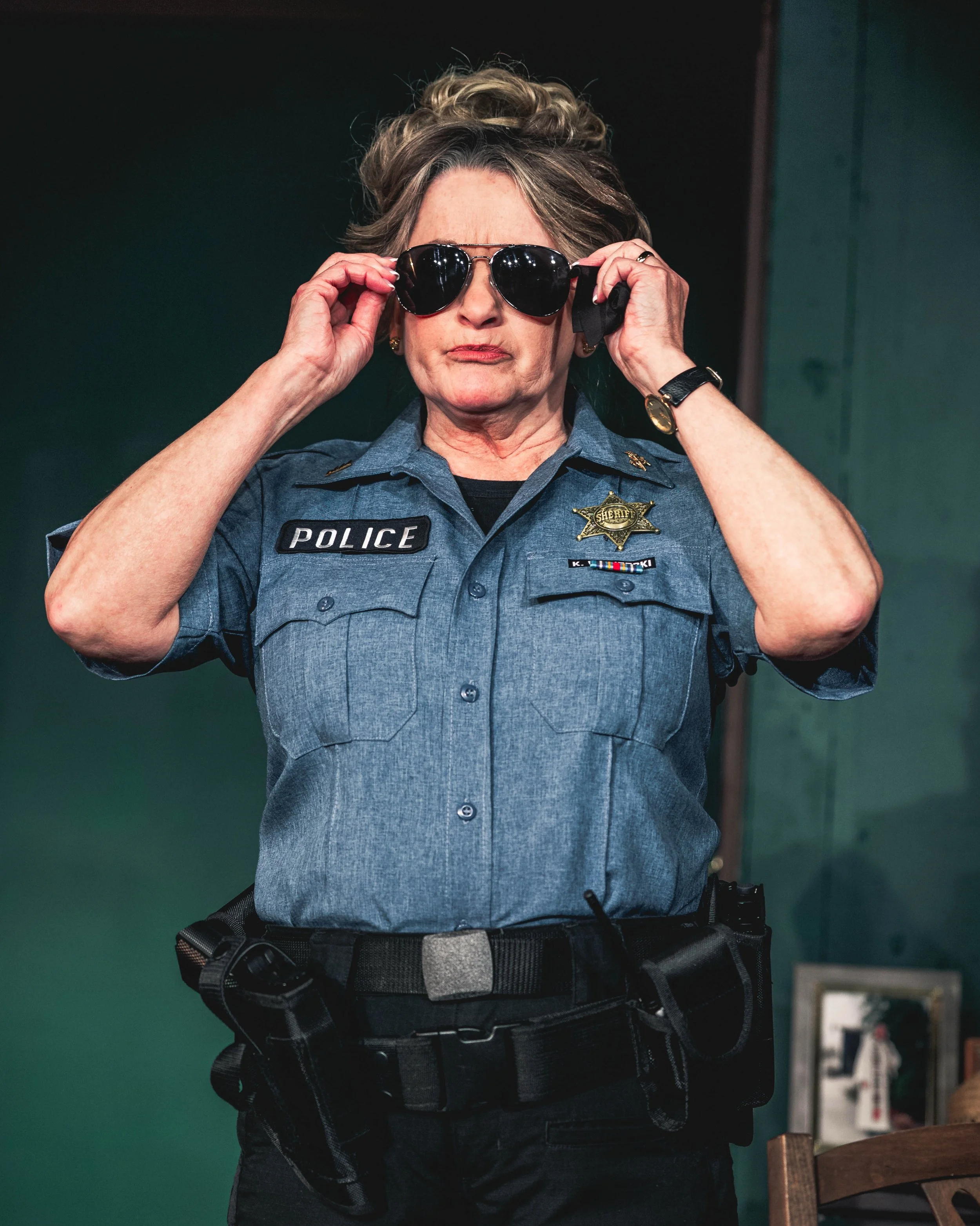The play itself follows our leading woman, Peg, as she grapples with loneliness, isolation, and depression after her husband’s unexpected passing in the years directly following the height of the pandemic. Her relationship with family friend Ryan (Leo Hernandez), who is much more like a son to her, is both a source of stability and frustration, though it is quickly upended after a theft of Peg’s belongings brings grudge-holding Sheriff Kris (Lisa Bryk) and well-meaning deputy Dani (Brooke Hutchins) into the picture.