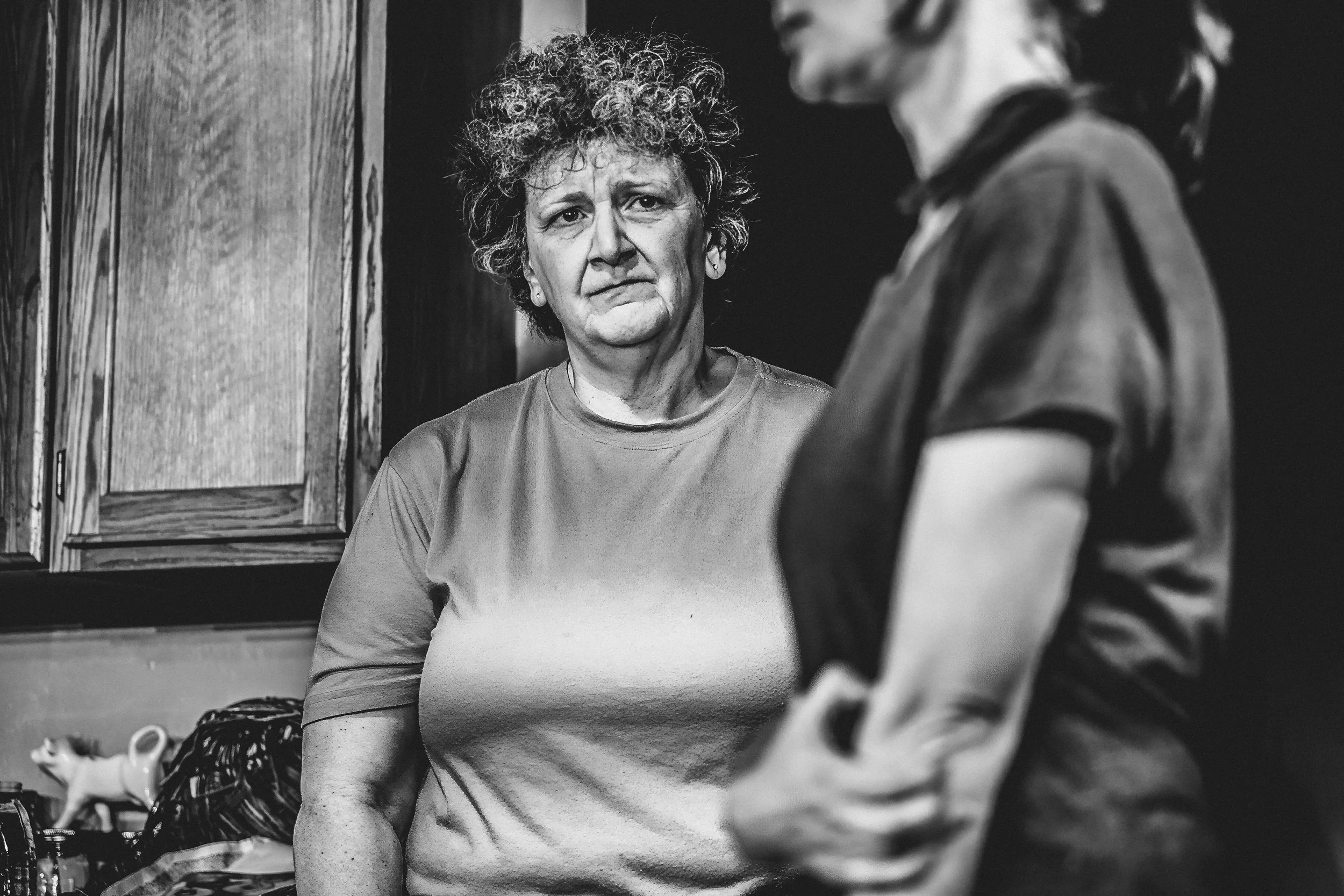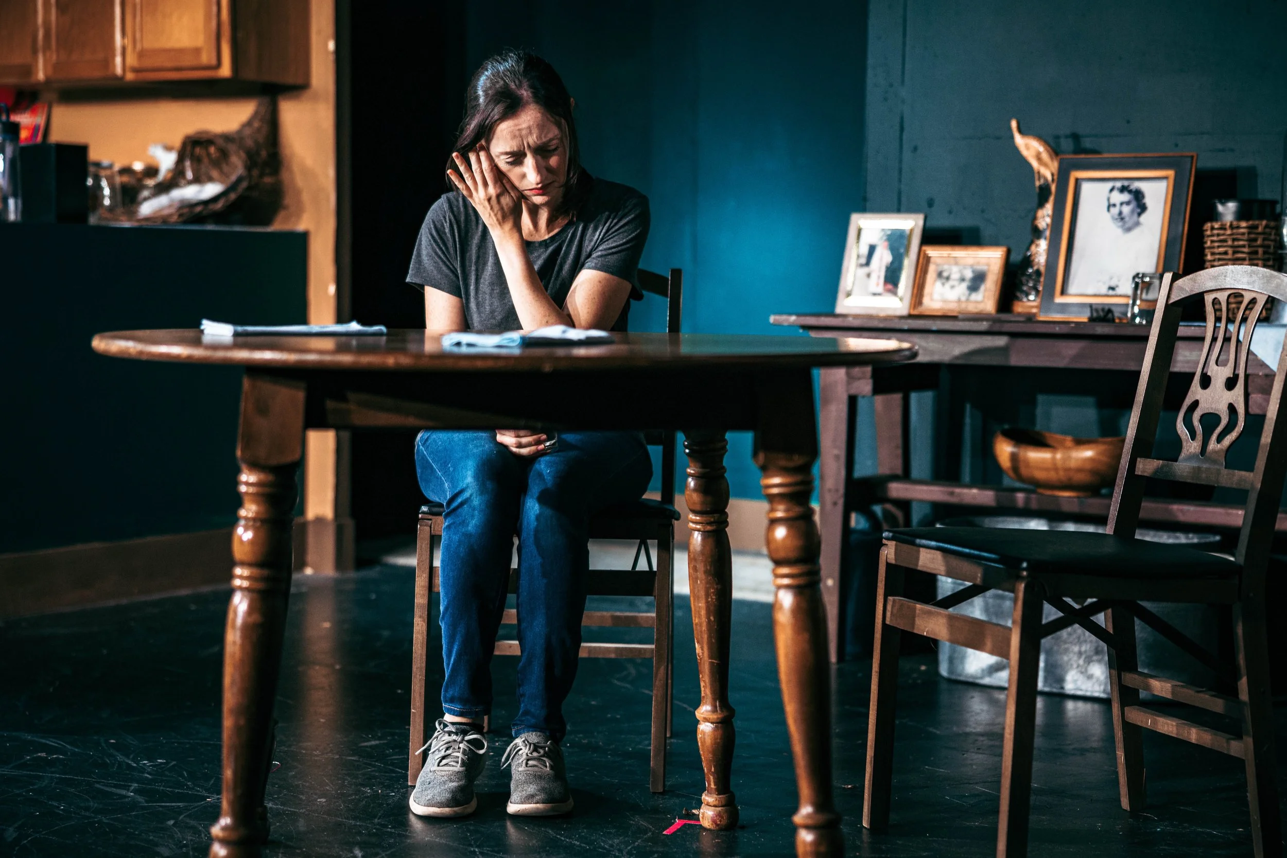 Long before that moment, though, I could see that this performance would be different from any Harbinger performance I had seen so far this year. With only four actors in the cast, it would be an intimate occasion, furthered by the fact that all the action of the play took place in the widowed Peg’s kitchen and dining room. The set struck me immediately. While other productions I’d seen this year were pretty bare on stage, this play would boast a kitchen that reminded me of my great-grandmother’s, complete with the yellow walls, small white fridge plastered with cards, photos, and reminders, odd knick-knacks on the walls and tops of cupboards, and dish towels galore, strewn across tables and oven handles. Without a person even appearing on stage, I was already moved as I brought my own personal life into those four walls.